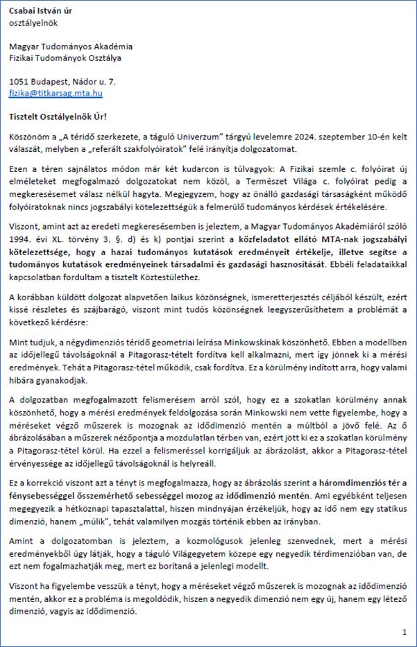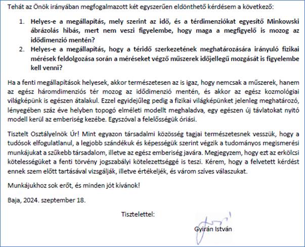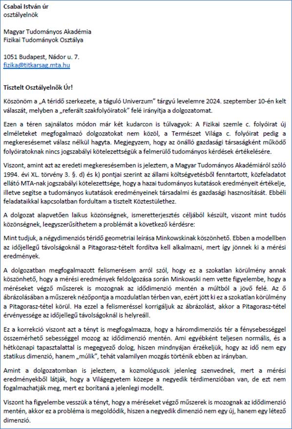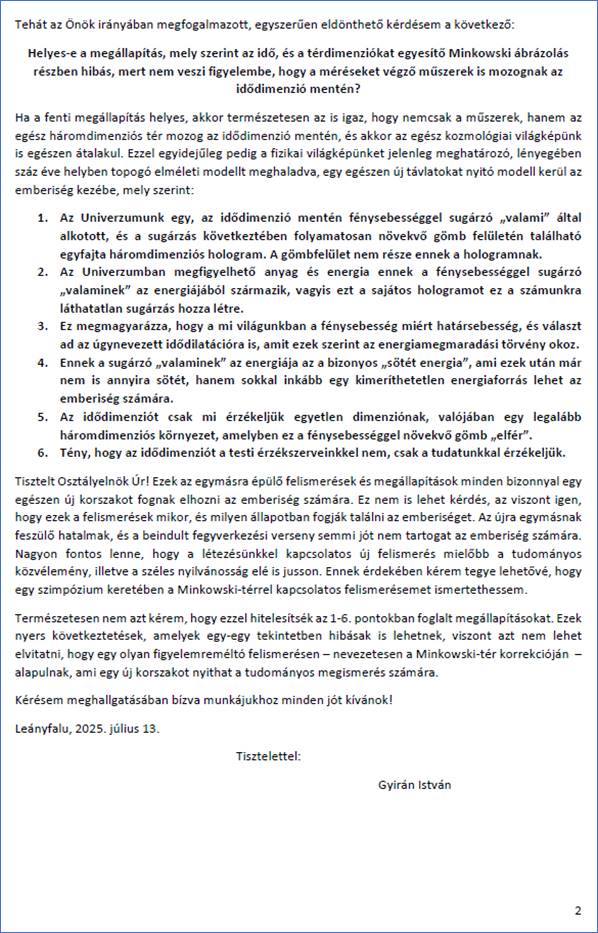 Ezt követően figyeltem az Akadémia rendezvényeit, de júniusig nem találtam olyan témájú előadást, amelynél a felvetésemmel előállhattam volna, ezért postai úton újabb levéllel fordultam az Akadémiához. Abból kiindulva, hogy talán a fizikusoknak kínos az ügy elővezetése, 2025. július 13-én az alábbi levelet küldtem az Akadémiának, melyben kértem, adjanak lehetőséget arra, hogy egy szűkebb körű tanácskozáson (szimpóziumon) a felismerést én magam ismertethessem.