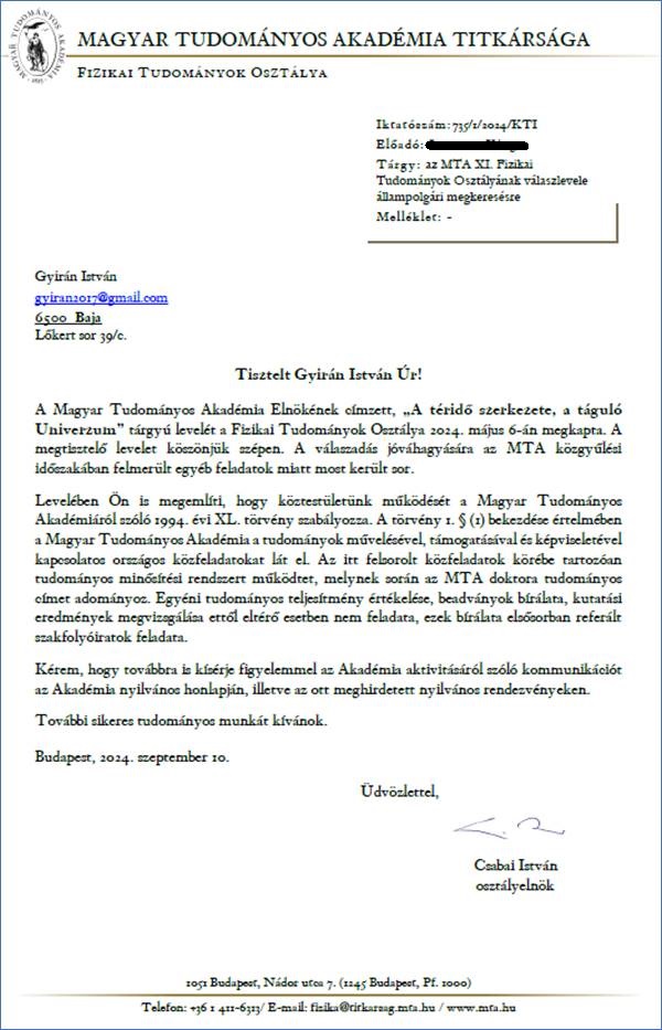 A fenti levelemre már nem kaptam választ, ezért 2025. február 18-án felhívtam az Akadémia Fizikai Tudományok Osztályát, ahol a korábbi válaszlevél előadójától megtudtam, hogy a második e-mail elkerülte a figyelmüket. Miután elolvasta a levelet, felajánlotta, hogy továbbítja a címzettnek, ugyanakkor biztosított arról, hogy erre is csak egy udvarias elutasító választ fogok kapni, tudniillik a kérdést „nem merik kiszignálni”. Ez számomra azt jelentette, hogy a felismerést, és az annak nyomán kialakuló tudományos eredményeket nem akarják, nem merik a tudományos közvélemény elé vinni. Hangsúlyozta, hogy a felvetésem nem alaptalan, ennek ellenére ne számítsak arra, hogy az Akadémia érdemben vizsgálni fogja. Javasolta, hogy a 200 éves évforduló kapcsán megrendezésre kerülő nyilvános rendezvényeken próbáljak személyesen megkeresni fizikusokat, akik talán felvállalják az ügyet. A beszélgetés végén azt kértem, hogy ez esetben ne érkeztesse a levelemet.